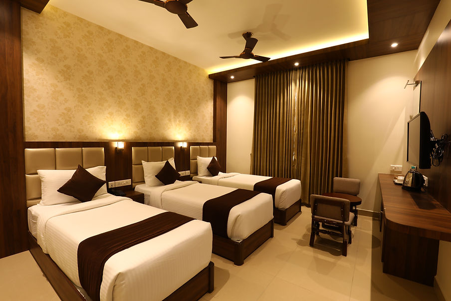 The corporate room is thoughtfully designed for a comfortable stay. It has 3 individual beds, extra seating complemented with warm upholstery, all amenities and a spacious, fully equipped bathroom.